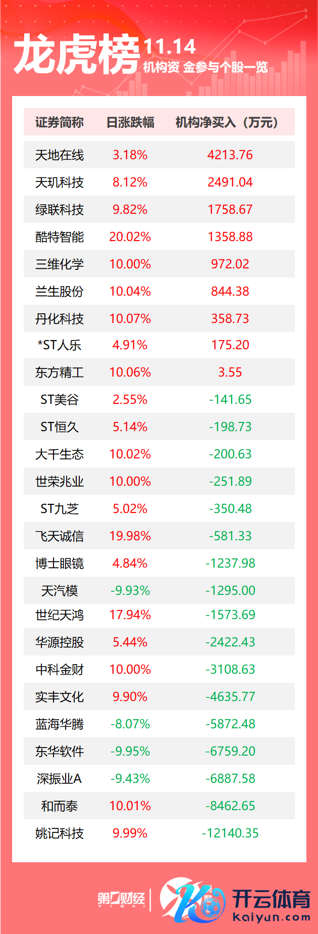 盘后数据露出,11月14日龙虎榜中开云(中国)kaiyun网页版登录入口,共26只个股出现了机构的身影,9只股票呈现机构净买入,17只股票呈现机构净卖出。