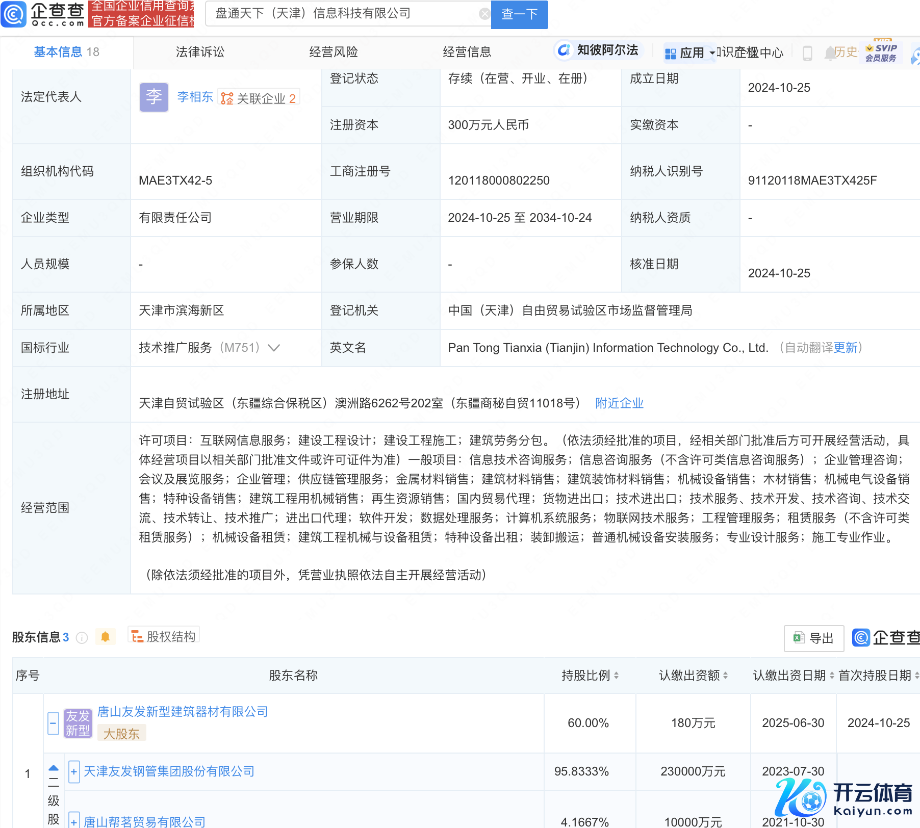 企查查APP败露,近日,盘通宇宙(天津)信息科技有限公司设备,法定代表东说念主为李相东,注册成本300万元东说念主民币,指标范围包含:互联网信息就业;野心计系统就业;物联网本领就业等。企查查股权穿透败露,该公司由友发集团(601686)旗下唐山友发新式建筑器材有限公司等共同握股。