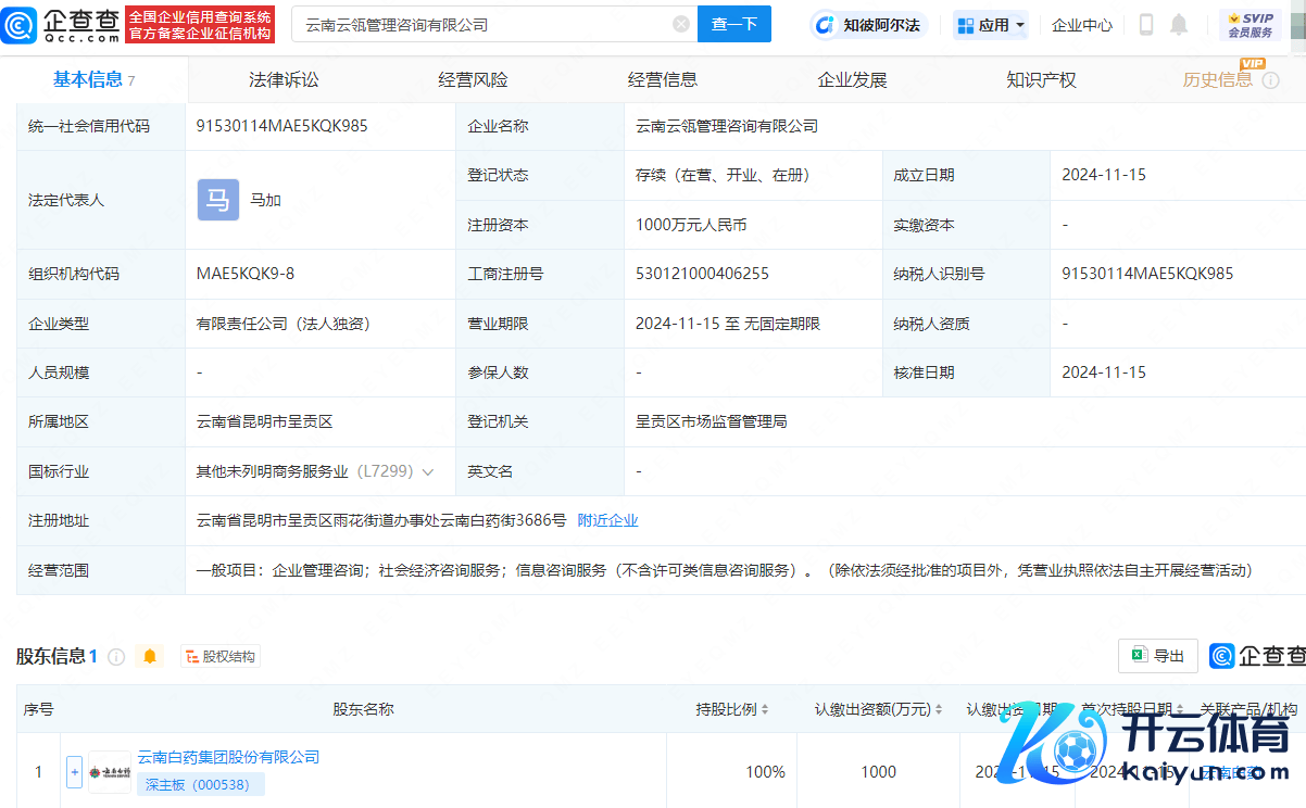 企查查APP知道开云体育,近日,云南云瓴责罚商榷有限公司诞生,法定代表东说念主为马加,注册本钱为1000万元东说念主民币,计较范围包含:企业责罚商榷;社会经济商榷处事;信息商榷处事等。企查查股权穿透知道,该公司由云南白药(000538)全资握股。