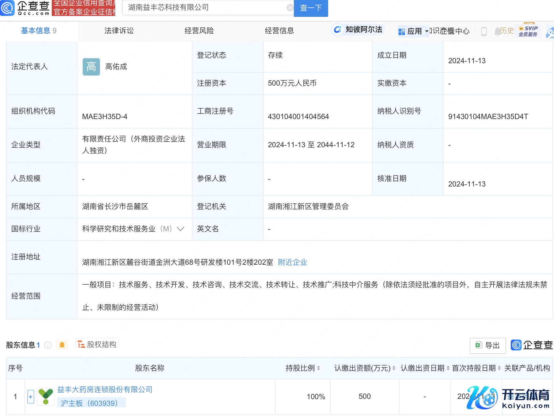 企查查APP领路,近日,湖南益丰芯科技有限公司建造,法定代表东说念主为高佑成开云体育,注册本钱500万元东说念主民币,标的限制包含:技巧劳动、技巧设备、技巧考虑、技巧疏导、技巧转让、技巧扩张;科技中介劳动。企查查股权穿透领路,该公司由益丰药房(603939)全资抓股。