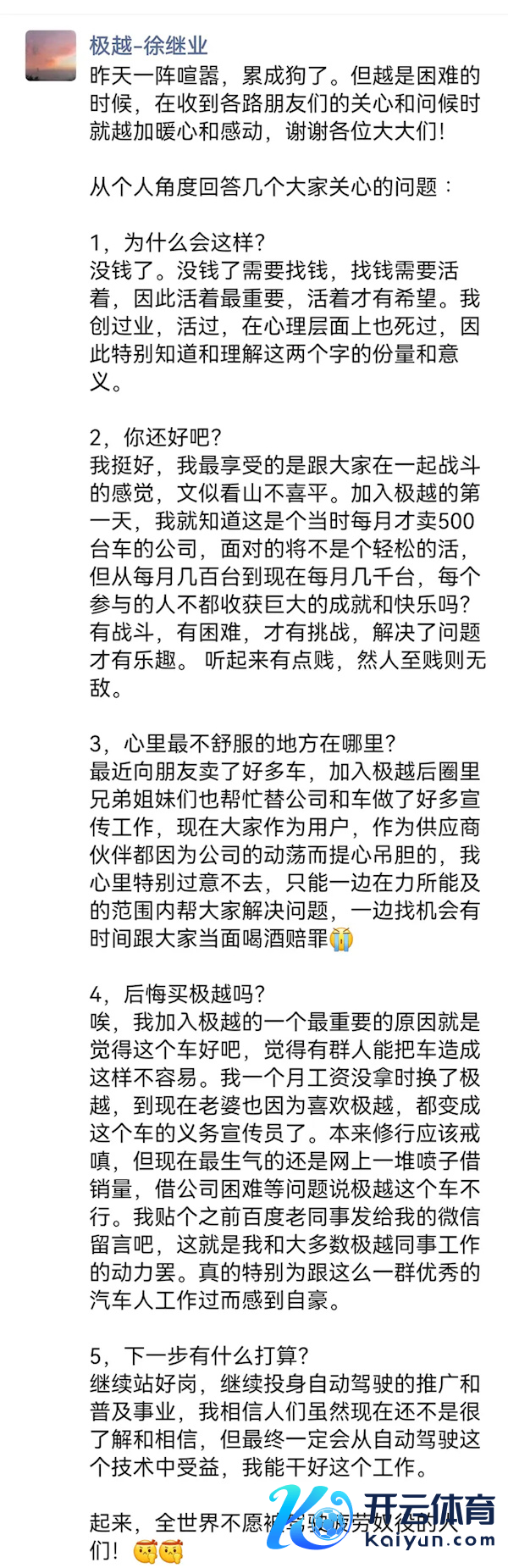 极越公关崇敬东谈主徐继业也发博暗示:“公司没钱了,没钱了需要找钱,找钱需要辞世,因此辞世最蹙迫,辞世才有但愿。”