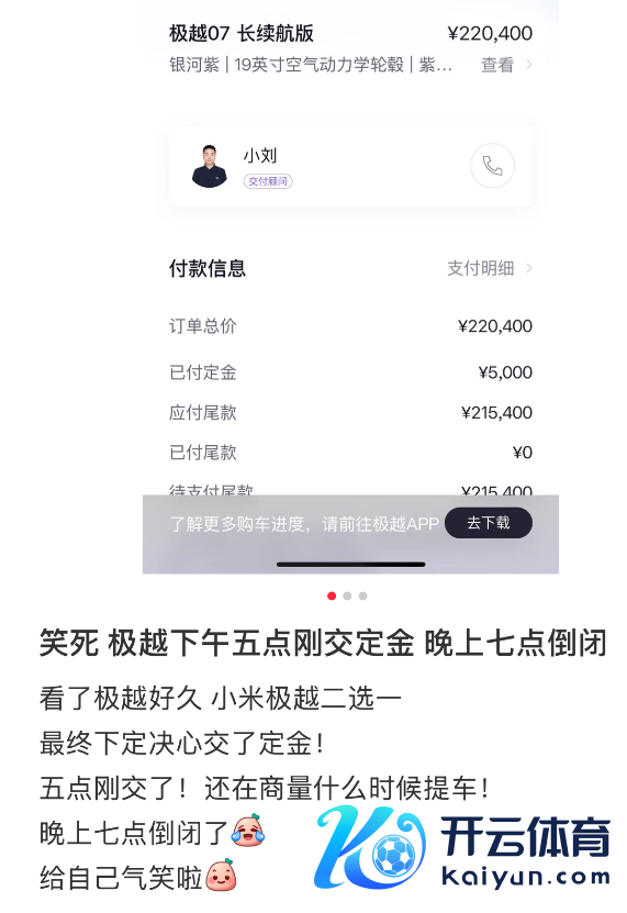 “看了极越好久,小米极越二选一。最终下定决心交了定金。五点刚交了,还在征询什么时候提车,晚上七点倒闭了。”