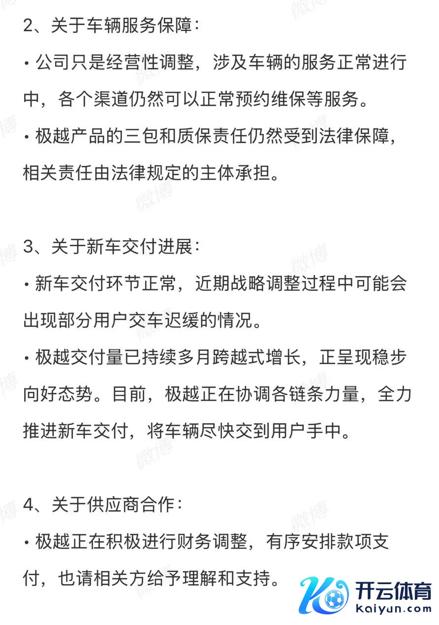 正在互助各方面资源应答挑战,正在积极激动融资。车辆就业方面,声明称公司仅仅商量性调解,触及车辆的就业闲居进行中,各个渠谈仍然不错闲居预约维保等就业。同期,极越产物的“三包”和质保背负仍然受到法律保险。