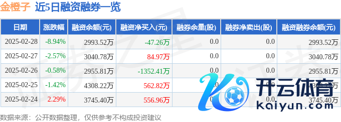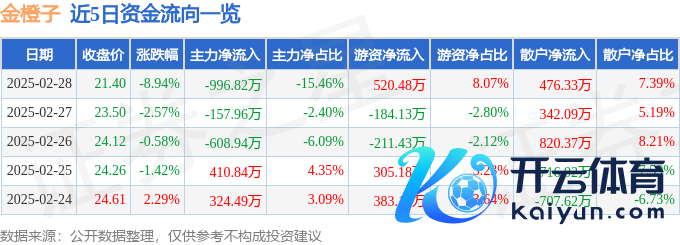 本站音讯,好意思满2025年2月28日收盘,金橙子(688291)报收于21.4元,下落8.94%,换手率8.65%开云体育,成交量2.91万手,成交额6447.49万元。